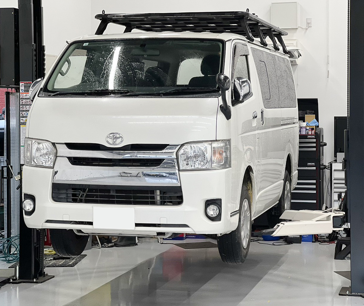 本日は、200系ハイエース、ヒッチメンバー取り付けの様子をお伝えします!