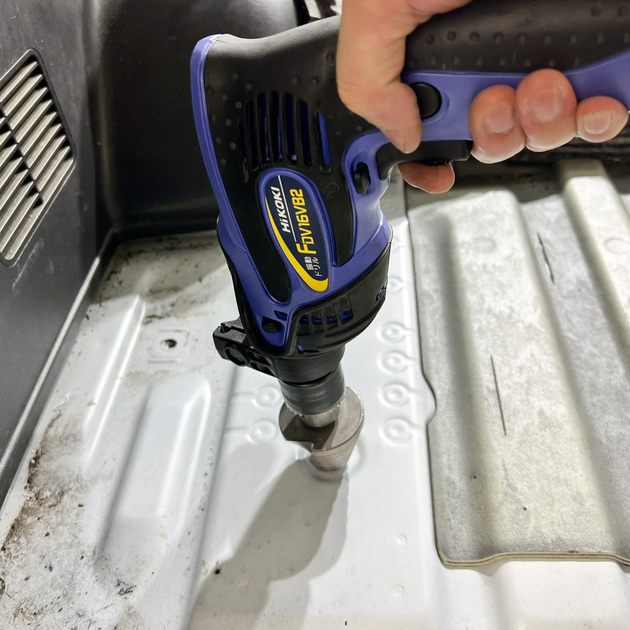 このヒッチメンバーの取り付けにはフロアパンへの加工が必要となりますので、荷室内のフロアマットをめくり
