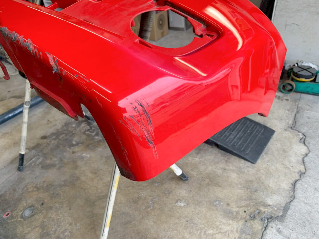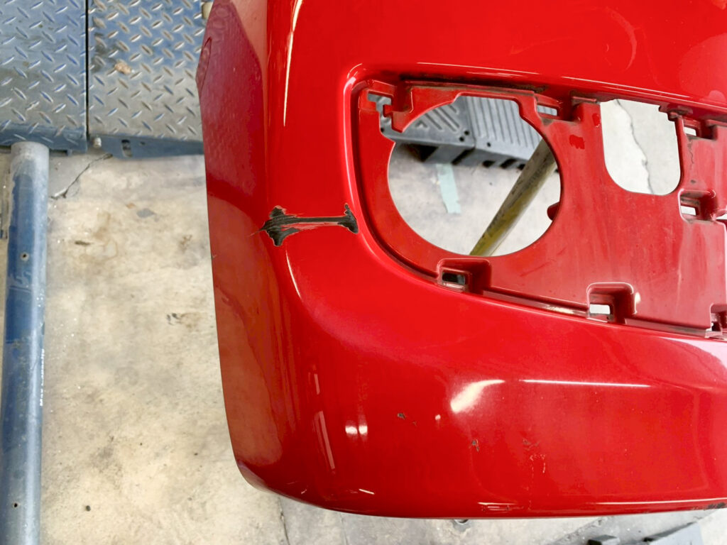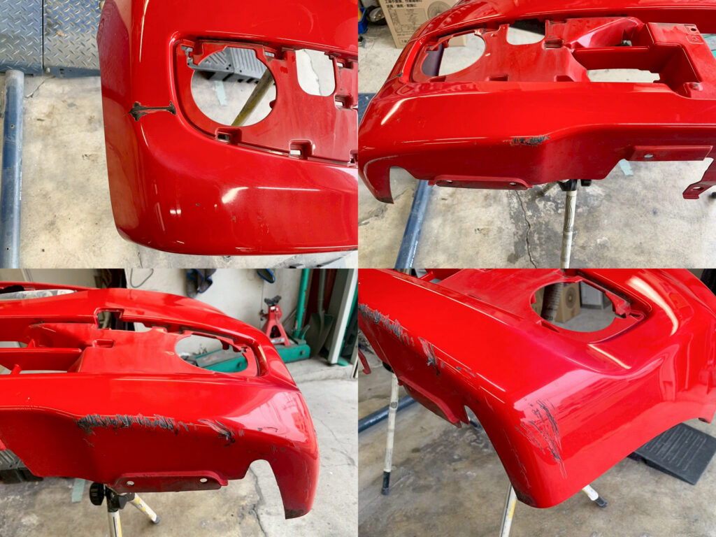 右側のえぐれた傷。歩道の植え込みの防護柵に接触とのこと。