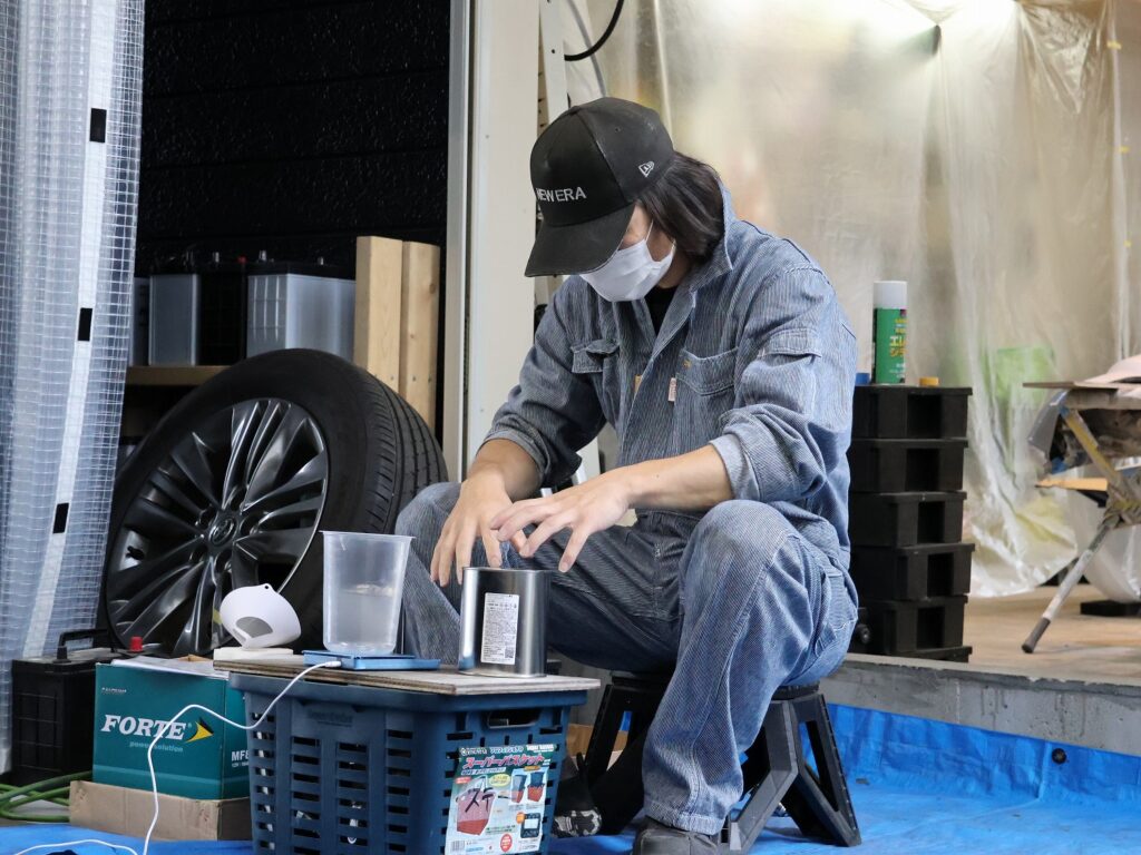 塗料を必要量入れ、ムラができないようにしっかりと混ぜ合わせ、吹き付け。